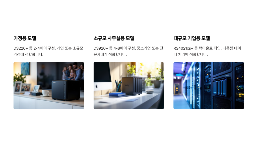 - 가정용 모델(예: DS220+): 2-4베이 구성으로 개인 사용자나 소규모 가정에 적합