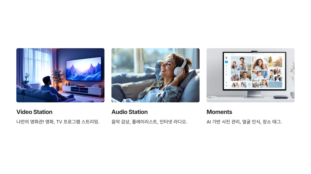 - Video Station: 개인 영화관을 만들어보세요. 영화와 TV 프로그램을 체계적으로 정리하고, 어디서든 스트리밍할 수 있어요.