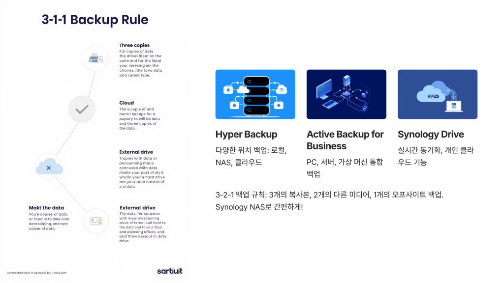 3-2-1 백업 규칙 아시나요? 3개의 복사본, 2개의 다른 미디어, 1개의 오프사이트 백업. Synology NAS로 이 모든 걸 쉽게 구현할 수 있어요!